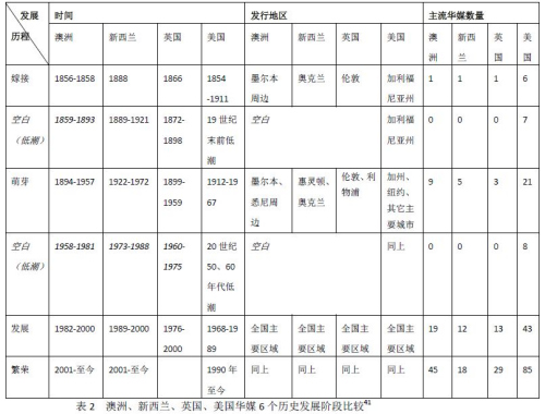 在地球的另一端英國,海外華文媒體的發(fā)展歷程和相距遙遠的美國、澳洲、新西蘭等也有不少相似。因為19世紀中期到英國的華人勞工逐漸增多,英國最早的華文媒體是1866年在倫敦出版的《飛龍報篇》,但與《唐人新聞紙》一樣,創(chuàng)刊幾年后就倒閉了,華文傳媒進入空白期。到19世紀末,華人數(shù)量的增多與經濟地位的提高,1899年《中英商工機器時報》創(chuàng)刊,此后華媒進入緩慢發(fā)展期,不少報刊都為中國國內形勢所影響。1958年2月,同時出現(xiàn)了兩份傾向于國民黨和共產黨的華報《自由中國新聞》、《中國新聞》,但因為華人數(shù)量減少而終于??A媒進入第二個空白期。但從70年代開始,華人移民數(shù)量的增多,新的華媒讀者市場又形成,香港媒體也來助力。 1976年7月,星島日報創(chuàng)立倫敦版,開創(chuàng)英國華媒新階段,直到21世紀初,越來越多的大陸華人,改變了華人受眾市場與華媒方針,新一輪繁榮,特別是華文電子媒體的繁榮持續(xù)至今。 總結北美、西歐、大洋洲海外華媒6個歷史發(fā)展時期的列表如下。