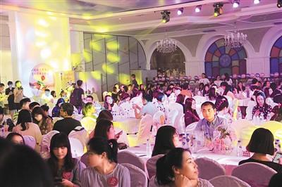 走進(jìn)天津婚博園大廈,筆者在電梯口又被堵了一陣,終于擠上第三趟電梯到達(dá)了四樓會(huì)場(chǎng)。30余張大圓桌、350多名歸僑及其他單身青年,讓寬敞的大廳略顯擁擠。白色的桌布、紅色的地毯和橘黃色的燈光,會(huì)場(chǎng)充滿了浪漫的氛圍。