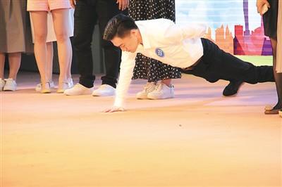 圖為一位男嘉賓在表演單手俯臥撐。