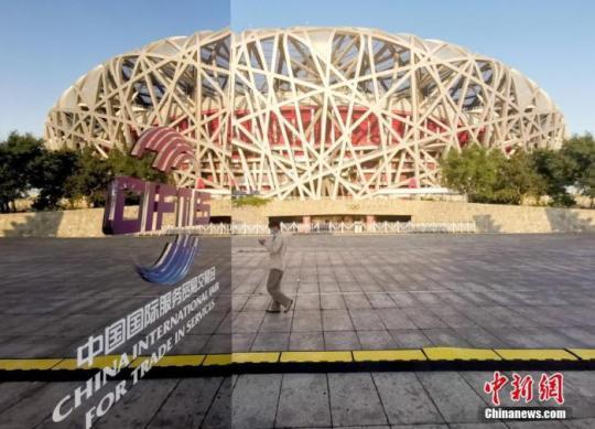 9月4日,2020年中國國際服務貿易交易會在北京開幕。本次服貿會是新冠肺炎疫情發(fā)生以來中國在線下舉辦的第一場重大國際經(jīng)貿活動。圖為9月4日傍晚拍攝的服貿會室外展區(qū)。 中新社記者 田雨昊 攝