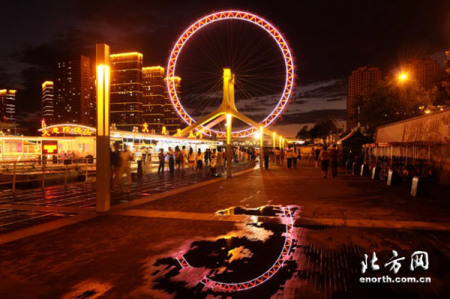 “天津之眼”摩天輪目前世界上唯一建在橋上的摩天輪。摩天輪直徑達 110米,設(shè)有 48個座艙,可供 384人同時乘坐。座艙旋轉(zhuǎn)到最高點時,相當(dāng)于 35層樓的高度,周邊景色一覽無余,游人能看到方圓40公里以內(nèi)的景致,是名副其實的“天津之眼”。每年夏天這里都會舉辦消夏晚會和天津鼓曲、京劇專場等多種特色主題活動,形成了獨具特色的“天津之眼”文化夜市。