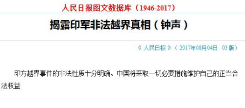 《人民日報》8月4日凌晨發(fā)表“鐘聲”題為“揭露印軍非法越界真相”的評論文章稱,何國家都不應低估中國政府和人民捍衛(wèi)領土主權的決心,中國將采取一切必要措施維護自己的正當合法權益。