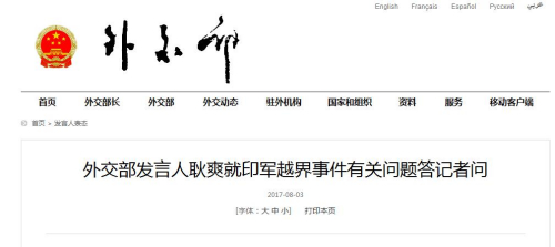 外交部網站8月3日傍晚發(fā)布了題為“外交部發(fā)言人耿爽就印軍越界事件有關問題答記者問”消息表示,截至8月2日下午,印軍仍有48人連同1臺推土機非法滯留在中國領土上,此外還有大量武裝人員集結在邊界線上和邊界線印方一側。他指出,印軍不論多少人員非法越界并滯留在中國境內,其性質都是對中國領土主權的嚴重侵犯,嚴重違反《聯(lián)合國憲章》,構成國際不法行為,印方應為此承擔相應的責任。并稱,印度方面的所作所為“絕不是為了和平”。