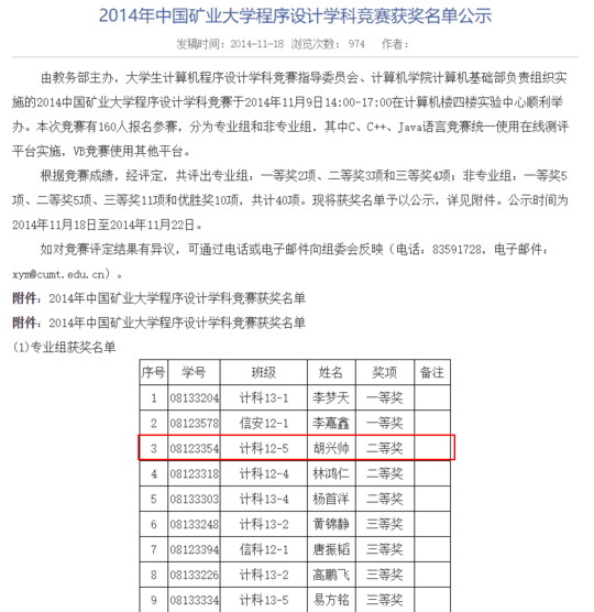 中國礦業(yè)大學(xué)安全工程學(xué)院團(tuán)委學(xué)生會在網(wǎng)上轉(zhuǎn)發(fā)了胡興帥的尋人信息,并表示胡是礦大校友。隨后,封面新聞記者在礦大計(jì)算機(jī)學(xué)院學(xué)生工作處得到證實(shí),胡興帥是計(jì)算機(jī)學(xué)院2012本科學(xué)生,目前已經(jīng)畢業(yè)。但胡在校具體學(xué)習(xí)生活情況如何,學(xué)生工作處表示不清楚。記者在中國礦業(yè)大學(xué)2014年公布的程序設(shè)計(jì)學(xué)科競賽獲獎(jiǎng)名單中發(fā)現(xiàn),來自計(jì)科12-5班級的胡興帥獲得了專業(yè)組二等獎(jiǎng)。