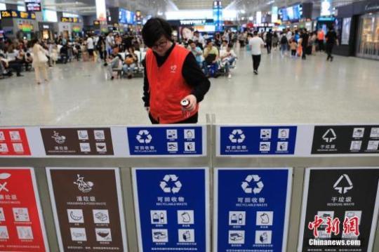 資料圖:上海虹橋火車站內(nèi)的垃圾回收箱。殷立勤 攝