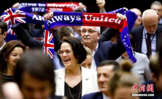 當(dāng)?shù)貢r(shí)間1月29日,歐洲議會(huì)批準(zhǔn)“脫歐”協(xié)議。圖為投票結(jié)束后,在場(chǎng)議員高舉“永遠(yuǎn)團(tuán)結(jié)”旗幟。中新社發(fā) 歐盟供圖