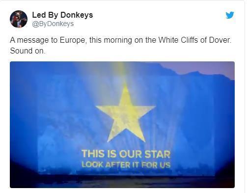 投影在英國(guó)多佛白崖上的視頻。圖片來源:社交網(wǎng)站截圖。