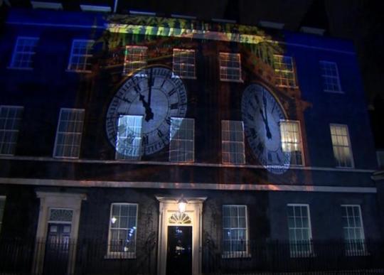 英國(guó)首相府外的燈光時(shí)鐘。圖片來源:英國(guó)廣播公司視頻截圖。