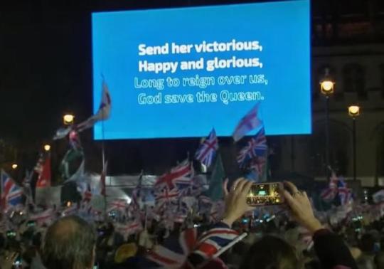 倫敦的議會(huì)廣場(chǎng)周圍懸掛著英國(guó)國(guó)旗,當(dāng)11點(diǎn)的鐘聲響起時(shí),廣場(chǎng)上爆發(fā)出一片歡呼聲,脫歐支持者們熱淚盈眶,唱起了《天佑女王》。
