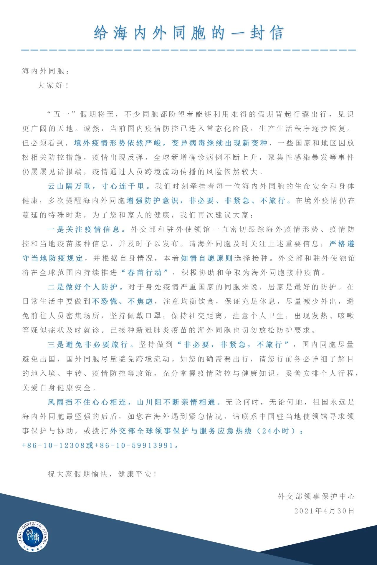 “五一”假期將至,外交部領事司發(fā)布致海內外同胞的一封信,呼吁同胞“五一”假期期間堅持做到“非必要,非緊急,不旅行”,國內同胞盡量避免出國,國外同胞盡量避免跨境流動。