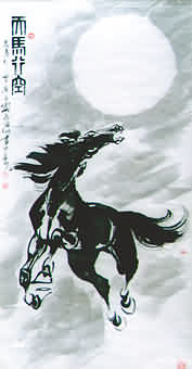 在他所有動物畫中,只有奔馬是用寫意筆法,他認為奔馬在人們心中是速度的代表,畫時必須用灑脫奔放、快速流暢的寫筆來揮灑,才能充分表現(xiàn)馬之精神,他曾用兩天時間完成了全長18米,100匹形態(tài)各異、造型生動的奔馬長卷,由此可見,冰凍三日非一日之寒,他要用畫筆寫出駿馬的英俊、彪悍、勇猛、真誠與耐勞。