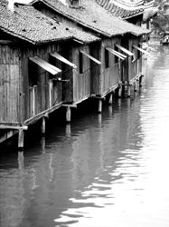 水閣和許多江南水鄉(xiāng)小鎮(zhèn)一樣,街道、民居皆沿溪、河而造,正所謂“人家盡枕河”。烏鎮(zhèn)與眾不同的是沿河的民居有一部分延伸至河面,下面用木樁或石柱打在河床中,上架橫梁,擱上木板,人稱“水閣”,這是烏鎮(zhèn)所特有的風(fēng)貌。水閣是真正的“枕河”,三面有窗,憑窗可觀市河風(fēng)光。茅盾曾在《大地山河》中這樣描述故鄉(xiāng)的水閣:“……人家的后門外就是河,站在后門口(那就是水閣的門),可以用吊桶打水,午夜夢回,可以聽得櫓聲欸乃,飄然而過……”傳說水閣是由一位機智的豆腐倌的違章建筑而來,可是隨著時間的遷移,許多歷史都已煙消云散,唯有這集生活的實用與享受于一體的建筑形式因著人們的喜愛而得以保存和延續(xù)。從某種意義上來說,水閣是烏鎮(zhèn)的靈氣所在,雖然它沒有奢華,難比高樓。有了水閣,烏鎮(zhèn)的人與水更為親密;有了水閣,烏鎮(zhèn)的風(fēng)貌更有韻味;有了水閣,烏鎮(zhèn)的氣質(zhì)更為優(yōu)雅;有了水閣,烏鎮(zhèn)的歷史添了一份委婉。水閣是烏鎮(zhèn)的特色,是烏鎮(zhèn)的魅力所在。