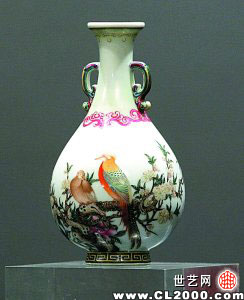 琺瑯彩“古月軒”錦雞圖雙耳瓶。它不但創(chuàng)下了亞洲藝術(shù)品的拍賣最高紀錄,也改寫清朝瓷瓶的全球最高價。目前所知的琺瑯彩瓷瓶存世僅有四只,其他三只分別在天津博物館、瑞士和英國兩個私人藏家手中,后兩只已有破損。天津博物館收藏的這只“清乾隆款琺瑯彩芍藥雉雞紋玉壺春瓶”,1960年博物館的收購價為13200元人民幣,時隔45年,同類瓷瓶市場價值翻升9060倍。