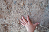 這段長(zhǎng)10米左右的土墻北半段保存相對(duì)較好,還有近2米高,而南半部隨著山勢(shì)向上攀升,損毀得幾乎只剩下了墻根。土墻周圍長(zhǎng)滿了荒草和低矮的灌木,記者隨于秉銀爬上山坡走到土墻的墻根。土墻上有規(guī)律地布滿了沿山勢(shì)向北傾斜的線條,仔細(xì)一看實(shí)際上墻上不同土層分割交接的界限!斑@是不同的土層,燕長(zhǎng)城用土夯筑的較多,施工時(shí)墻的兩邊用木板夾住,中間填滿土,然后夯實(shí)。每個(gè)土層的厚度都不相同,薄的8厘米,厚的15到20厘米左右!