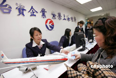 12月19日,2006年兩岸春節(jié)包機(jī)上海航點(diǎn)開始售票。由于今年“兩岸春節(jié)包機(jī)”向所有臺(tái)胞開放,所以機(jī)票格外緊俏,銷售也隨之火爆起來(lái)。(中新社/湯彥俊攝)