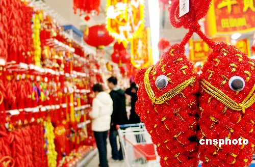 1月4日,鄭州丹尼斯百貨超市的“年貨”街?jǐn)[了出來,掛飾、食品、飲料、保健品、兒童服裝等一應(yīng)俱全,來搶占春節(jié)巨大的消費市場。(中新社/馬健 攝)