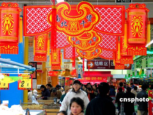 1月8日,市民在南京某超市“年貨大街”選購年貨。雖然離農(nóng)歷新年還有20多天,但在這個雙休日,南京市的眾多商家不約而同地在場內(nèi)開設“年貨大街”,將種類繁多的年貨擺上柜臺,供市民利用雙休日提前購置年貨,商場內(nèi)人頭攢動,呈現(xiàn)出購銷兩旺的喜人景象。 (中新網(wǎng)/鐘山 攝)