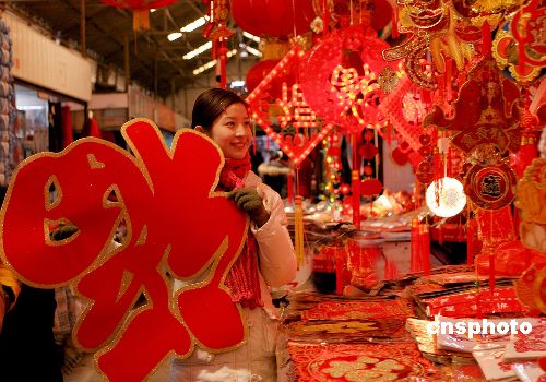 1月7日,一名女孩在一家新年喜慶用品里選購一幅超大的新年福字飾品。春節(jié)將至,裝點(diǎn)節(jié)日氣氛的大紅“!薄ⅰ按骸弊帧吧す贰背蔀槭袌龅膶檭。商家備足了賀歲的吉祥飾物,擺滿店里,一派喜氣洋洋,紅紅火火的熱鬧景象。(中新社/王璋聞 攝)