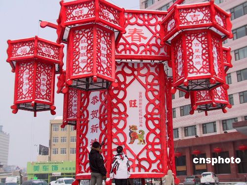 中國(guó)農(nóng)歷春節(jié)日益臨近,長(zhǎng)春市一商家在門(mén)前制作了一只巨型宮燈,營(yíng)造出喜慶祥和的氣氛,吸引眾多市民駐足觀看。這只巨型燈籠名叫六角宮燈,高8米,直徑6米,周邊陪襯著三對(duì)六只高3米、直徑2米的“小”燈籠。(中新社/王宇 攝)