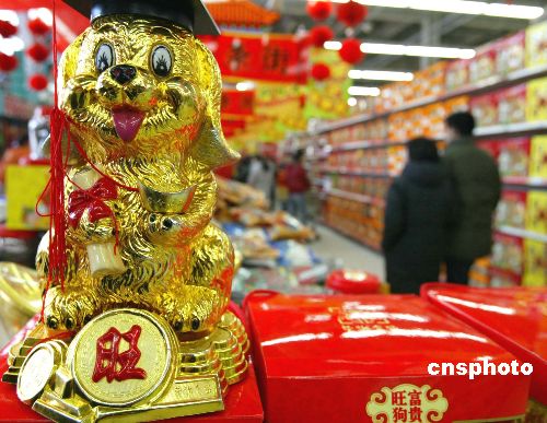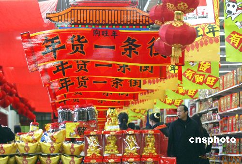 一月二十五日,距離中國傳統(tǒng)的農(nóng)歷春節(jié)狗年還有數(shù)日,北京節(jié)日市場呈現(xiàn)出紅紅火火的景象,許多商場、超市布置的喜氣洋洋,為即將過佳節(jié)的人們增添節(jié)日的愉快。(中新社/任海霞 攝)