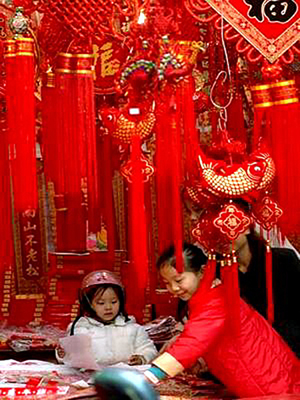 福州小朋友正開心地挑選節(jié)慶飾品。隨著春節(jié)臨近,經(jīng)營民俗用品商站集中的福州鼓西路已被大紅燈籠、中國結(jié)等飾品映紅。(來源:福建鄉(xiāng)音)