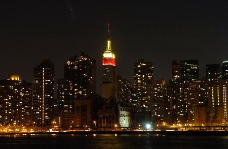 隨著主持者象征性地按下大樓80層的電閘開關(guān),帝國大廈頂端的1300多盞彩燈頓時(shí)點(diǎn)亮成紅黃兩色,給暮色中的紐約市增添了不少喜慶色彩。