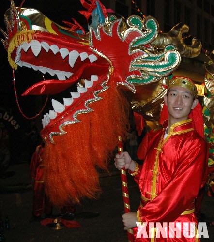 | 1月28日,在新西蘭首都惠靈頓街頭,當?shù)厝A僑舞獅隊向人們獻藝,歡慶中國傳統(tǒng)農(nóng)歷春節(jié)。(新華社) |