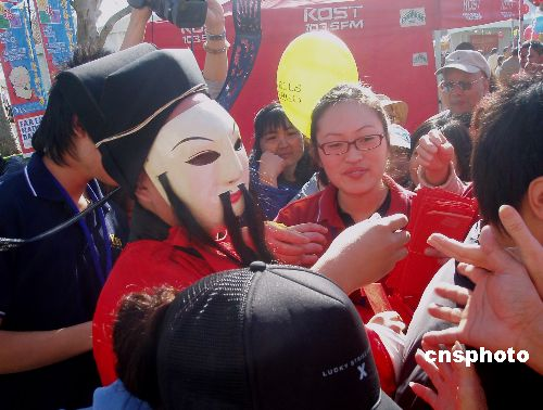 | 美國洛杉磯華人華僑歡聚新年嘉年華,迎接中國農(nóng)歷狗年來臨,財神爺向年輕一代新華人發(fā)放紅包。(中新社) |