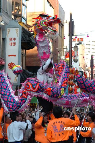 下午三時(shí)以后,橫濱中華街新春巡游正式開始。在日本警察的開道下,身穿皇族服飾的清朝“皇帝與格格”緩緩踱步而來,“太監(jiān)”“宮女”跟隨身后。如此裝扮引起了在場圍觀的日本民眾的極大好奇,不一會“皇帝”便被在場的閃光燈晃地睜不開眼睛。隨著鞭炮聲聲,鑼鼓齊鳴,來自橫濱幾所中華學(xué)校的舞龍舞獅隊(duì)相互較著勁舞進(jìn)人群。在密集的鑼鼓聲中,舞龍隊(duì)舞的是虎虎生風(fēng)。在領(lǐng)頭龍珠的引領(lǐng)下,幾條巨龍上下翻飛,好不熱鬧。而隨著繡球的挑逗,幾頭銀獅也是耍得酣暢淋漓,跳閃騰挪,有板有眼,博得了在場觀眾的一片叫好聲。一個(gè)小時(shí)的巡游在不知不覺中過去,觀眾意猶未盡,望著舞龍舞獅隊(duì)的背影依依不舍。
