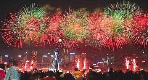 未到八時(shí),維港兩岸已聚集了數(shù)十萬市民及游客。據(jù)介紹,是次煙花匯演全長共約二十三分鐘,共分十幕,最特別的環(huán)節(jié),包括有“財(cái)神笑臉”及“笑聲”。