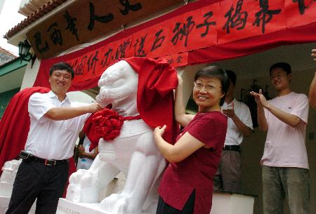 巴西華人文化交流協(xié)會理監(jiān)事29日中午在該會新近購置的會館里,同中國駐里約熱內(nèi)盧總領(lǐng)館官員共度新春佳節(jié)。會館大廳里歌聲陣陣、笑語聲聲。當(dāng)協(xié)會主席尹霄敏和中國駐里約熱內(nèi)盧總領(lǐng)館代總領(lǐng)事王燕平共同為剛剛從中國運抵里約的一對巨大石獅揭幕時,全場響起熱烈掌聲,聯(lián)歡會達到高潮。