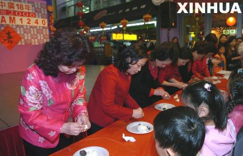 2月11日,美國紐約州華裔議員孟廣瑞(右二)和社區(qū)代表一起參加包元宵比賽。(新華社)