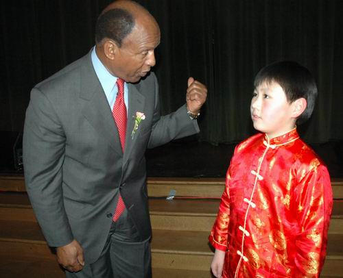| 伊利諾州州務(wù)卿杰西·懷特和身穿民族服裝的小來賓親切交談。(人民網(wǎng)) |
