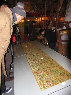 據(jù)了解,每臺織機分樓上樓下兩部分,織造時,樓上拽花工根據(jù)花本要求,提起經(jīng)線,而樓下織手則根據(jù)“程序”對織料上的花紋,妝金敷彩,拋梭織緯。一根緯線的完成,需要小緯管多次交替穿織,自由換色,工藝十分復雜,上下兩人配合,一天僅能織5-6厘米,所以古人有“寸錦寸金”之說。而今云錦已成為南京的標志性“產(chǎn)品”,去年連戰(zhàn)、宋楚瑜分別訪問南京、江蘇省向他們贈送的禮物都是云錦“金絲團龍”。