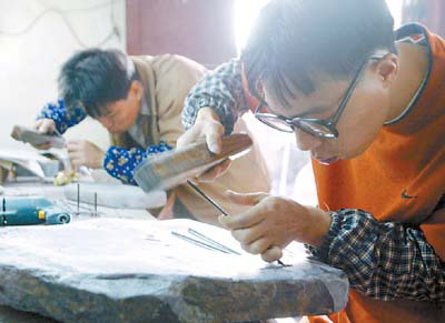 目前,該村288戶,1100多人,半數(shù)以上人口從事制硯。至今,每年產(chǎn)硯約8萬件!爸袊顺幷褂[館”已在該村落成。