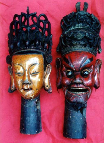 在儺祭中,面具起著十分重要的作用。儺祭之風(fēng)盛行的商周時(shí)期,為了在儺祭中獲得強(qiáng)烈的祭祖效果,主持儺祭的方相氏佩戴著“黃金四目”面具!吨芏Y·夏官》說:“方相氏掌蒙熊皮,黃金四目,玄衣末裳,執(zhí)戈揚(yáng)盾,帥百隸而時(shí)儺,以索室驅(qū)疫。”方相氏成了“驅(qū)鬼逐疫、消災(zāi)納吉”的神化形象,那模樣神秘可畏。在儺戲表演中,面具則成了儺戲造型藝術(shù)的重要手段,也是儺戲最為重要、最為典型的道具。演員佩戴面具是儺戲區(qū)別于其他戲劇的重要特征。