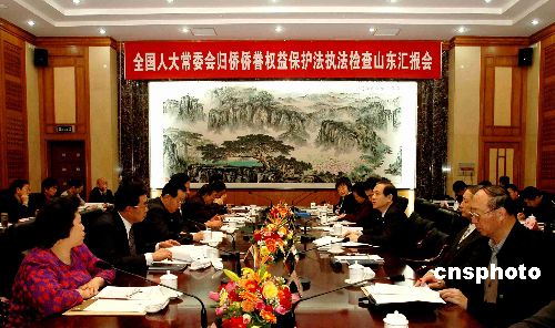 中新社青島四月二十二日電 (記者 周兆軍)全國人大常委會《歸僑僑眷權(quán)益保護(hù)法》執(zhí)法檢查小組,今天結(jié)束了在山東省的執(zhí)法檢查。在臨行前的反饋會上,全國人大常委會副委員長韓啟德強(qiáng)調(diào),各地政府要進(jìn)一步加大依法護(hù)僑的工作力度,切實(shí)維護(hù)海外僑胞和歸僑僑眷的合法權(quán)益。