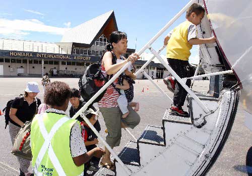 22日,中國政府開始用包機從所羅門群島撤出被困中國僑民。中國駐巴新使館租用的飛機飛往霍尼亞拉,并于當晚安全把第一批僑民共90人接到巴新首都莫爾茲比港,其中主要是老、弱、婦、幼以及20名香港同胞。23日,又有168名中國僑民分乘使館包機離開所羅門群島,抵達莫爾茲比港。24日,中國政府包機撤出最后一批63名在所羅門群島受困僑民抵達莫爾茲比港。當天,中國政府派出南方航空公司包機迎接暫避于巴新的中國僑民,約300名僑民于25日凌晨抵達廣州。