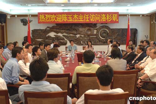 中國(guó)國(guó)務(wù)院僑務(wù)辦公室主任陳玉杰所率代表團(tuán)三日與洛杉磯三十多位僑領(lǐng)座談。僑領(lǐng)們?cè)凇澳锛胰恕泵媲皶乘,中?guó)國(guó)家僑務(wù)主官們也是有問必答,僑領(lǐng)、僑官面對(duì)面,兩個(gè)多小時(shí)的對(duì)話交流仍意猶未盡。