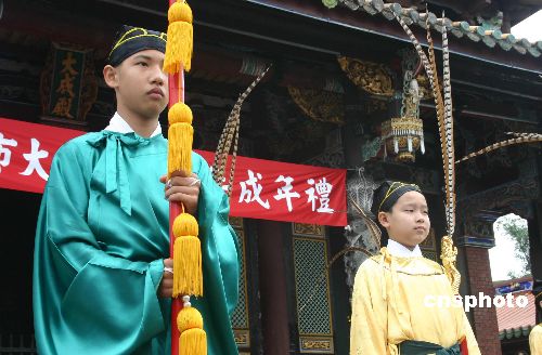 在中國古禮中,男子年二十而行冠禮(成年禮),通過莊嚴儀式的形式告誡他們“棄爾幼志,順爾成德”,就是要禁絕少年嬉鬧的童心,擔負起成年人的責任;顒咏M織者說,他們每年都要組織成年禮活動,選擇在孔廟舉行,更是希望讓所有年輕學子在孔老夫子面前,許下心愿,期望能心想事成,金榜題名。