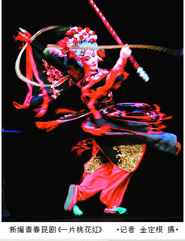 相比傳統(tǒng)昆曲的纏綿悱惻,青春昆劇《一片桃花紅》透著時尚氣息,一下子拉近了“遺產(chǎn)”昆劇與年輕觀眾之間的距離。當(dāng)大幕徐徐拉開,一片桃林映入眼簾,面繪桃花、身著紅衫的谷好好一亮相就引得臺下叫好不迭。亮麗獨特的造型和精彩紛呈的打斗一下子就吸引了他們的眼球。一位蘇州大學(xué)的朋友說,她喜歡這樣有文有武、且歌且舞、臺詞簡單、舞美漂亮的青春昆劇。桃花與落紅是一種美的意象,給人以無窮回味。老戲迷們也認為,該劇大氣磅礴,將傳統(tǒng)融入現(xiàn)代,在繼承傳統(tǒng)的基礎(chǔ)上勇于探索和創(chuàng)新,使古老藝術(shù)煥發(fā)出迷人的青春魅力。