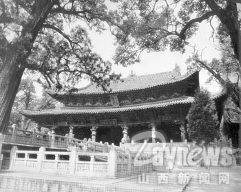 ——獻(xiàn)殿,建于金大定八年(1168年),原為祭祀時陳列供品的場所。外觀屋頂對稱,甚有氣勢;內(nèi)視梁架極為特殊,只在四櫞木伏上放一層平梁,既簡單省料,又輕巧堅固。四周無壁,只有直欞柵欄,既像一座穩(wěn)重的大殿,又如一幢玲瓏的涼亭,顯得格外利落敞亮。是我國古代建筑的瑰寶。