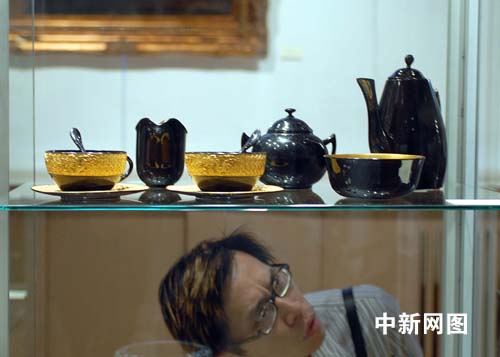| 宋美齡收藏的金彩漆茶具只展出,不拍賣。(中新社/龔文謨 攝) |