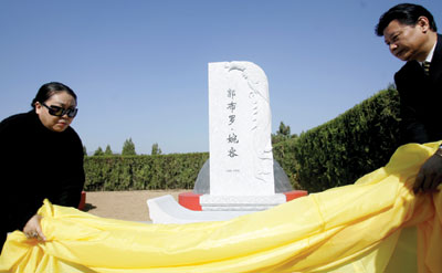 隨后,黎園和任汝強(qiáng)將蓋在墓碑上的黃綢揭開,黎園致悼詞:“這既了卻了郭布羅·潤(rùn)麒先生和后輩們六十年的心愿,也為婉容戲劇般悲慘的人生落下了歷史的帷幕。”大家三鞠躬后,落葬儀式結(jié)束。