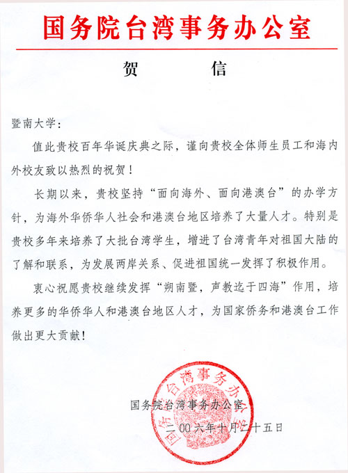 國(guó)務(wù)院臺(tái)灣事務(wù)辦公室賀信