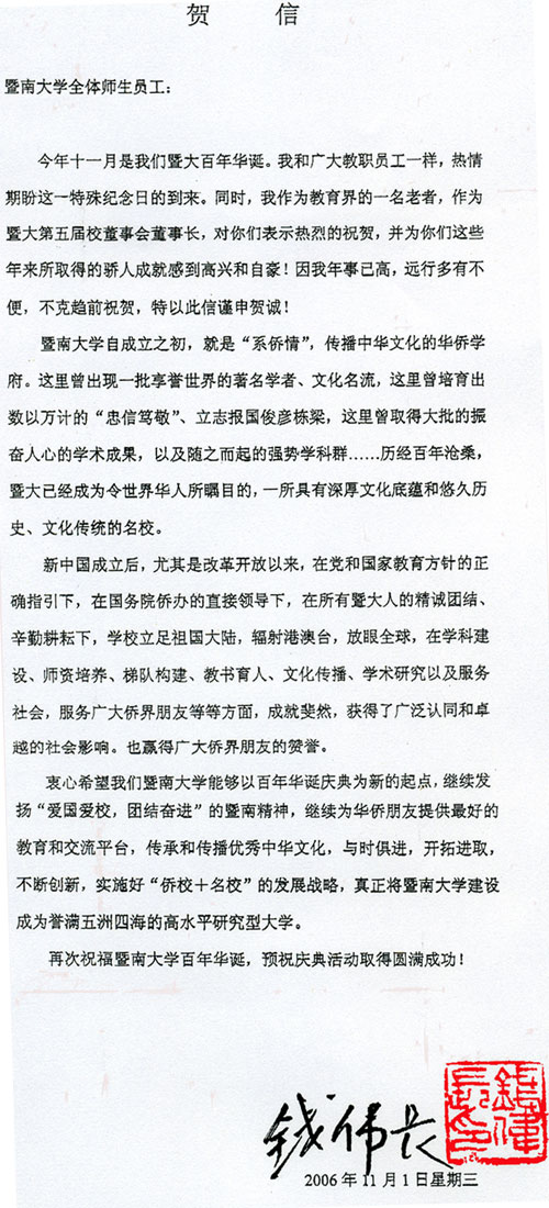 錢偉長賀信