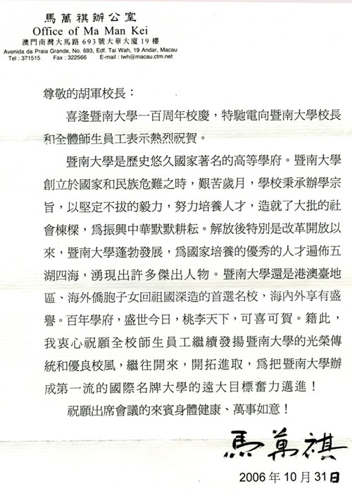 全國政協(xié)副主席、澳門中華總商會會長、澳門大華行投資有限公司董事長,暨南大學(xué)董事會副董事長馬萬祺