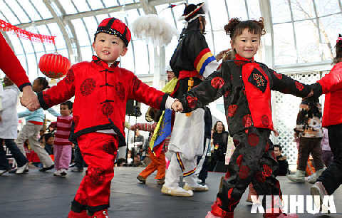 | 2月10日,兩名華裔兒童在美國紐約舉行的中國春節(jié)慶典上表演牽手舞。 |