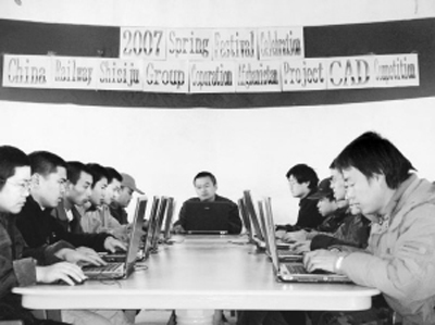 農(nóng)歷年三十(2月17日)上午8時,阿富汗梅巴項目工地會議室。一場別開生面的電腦CAD制圖比賽正在進行,12臺電腦相對而排,項目經(jīng)理吳景文也參與其中。比賽要求選手必須在規(guī)定時間內(nèi),制定出相應(yīng)的工程圖紙。一時間,整個會議室鴉雀無聲,大家都想拿出自己的絕活,贏取比賽的勝利。相臨的一間辦公室里,則正在進行中國象棋的“捉對廝殺”。