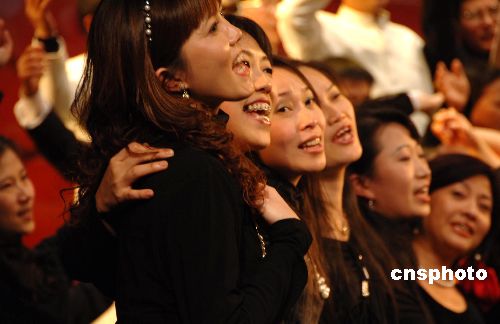 1月20日晚,第四屆“海峽兩岸同唱一首歌---2008閩臺新春合唱音樂會”,在福州市鳳凰劇院舉行。圖為臺北藝術家合唱團、臺北教育大學、臺中萱韻合唱團、金門縣合唱團、福建榕樹合唱團、福建省聶耳合唱藝術團、福建省音樂家協(xié)會室內(nèi)合唱團的藝術家,同臺合唱《月亮代表我的心》。中新社發(fā) 鄭祚聲 攝